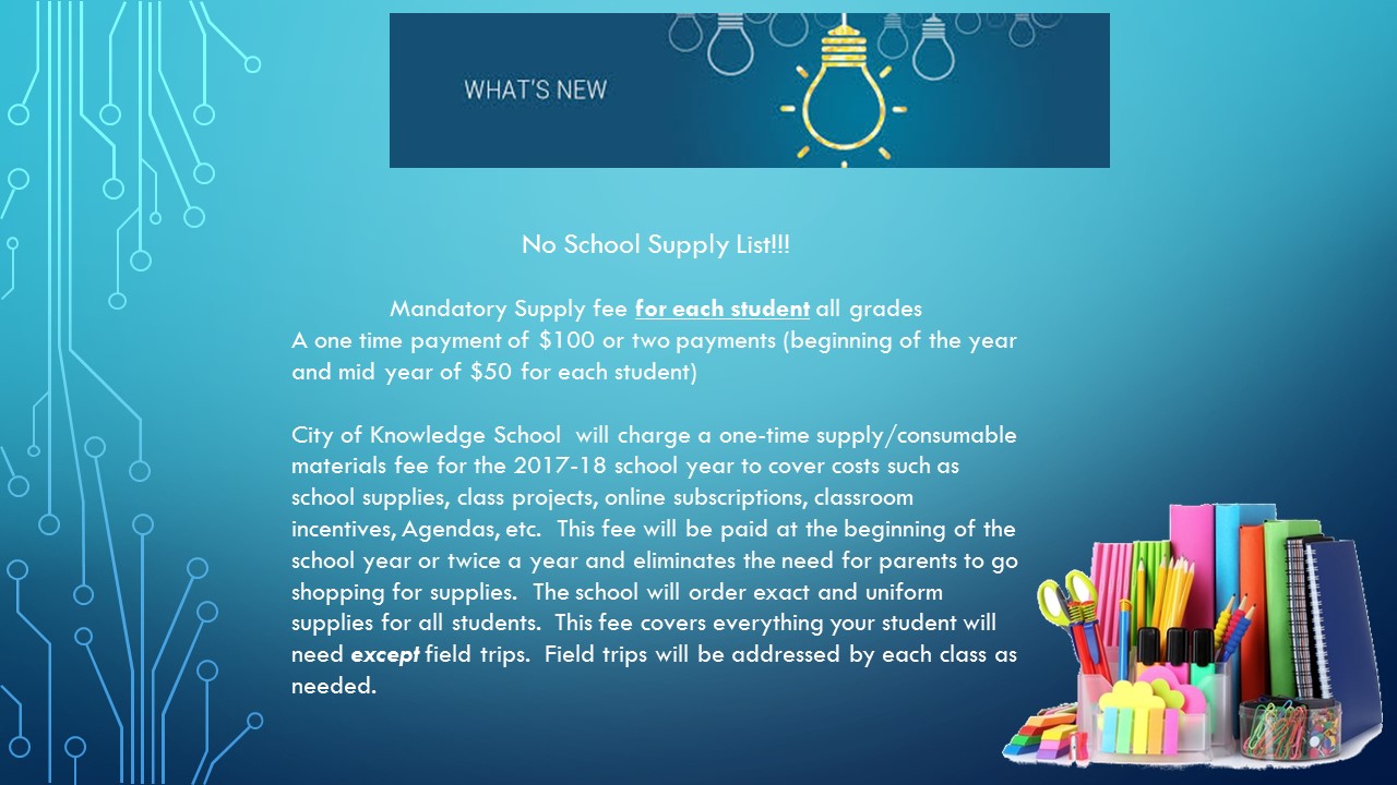 The City of Knowledge Islamic School is a private Islamic school, and as a result, the only means of financing the school's operations is to charge tuition, fees, receive donations, and conduct fundraising events.